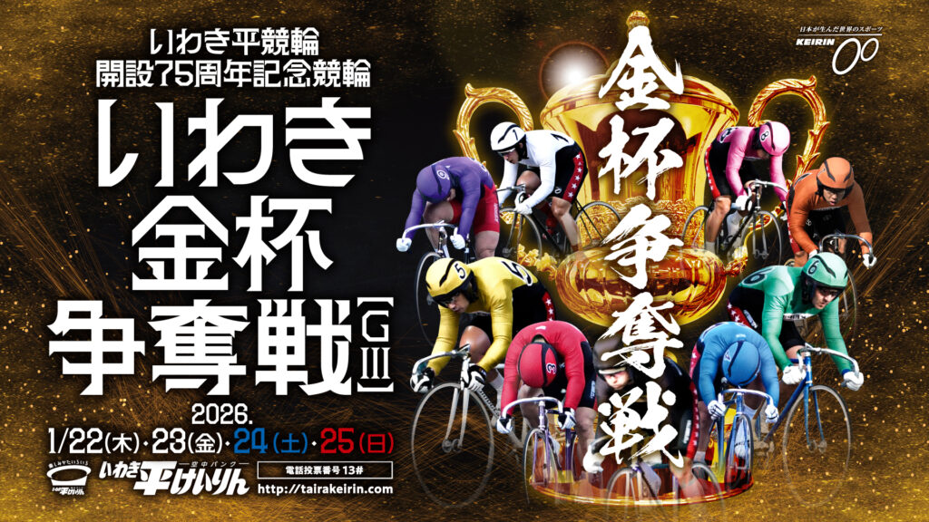 「いわき平競輪開設75周年記念競輪 いわき金杯争奪戦【GⅢ】」の特設サイトをオープンしました。まずは、アクセス情報(無料バス含む)、横断幕・電子横断幕「エールビジョン」について掲載しています。コンテンツは随時更新していきます。